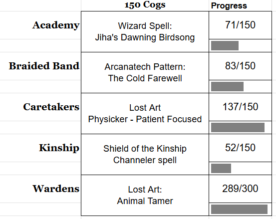 Cogs are the name we have given our Out-of-Game currency. For those coming to us from Alliance, Altera Awakens, and Rule of Three games you know these as Goblin Stamps, Cookies, and Buttons.